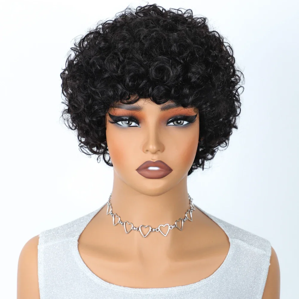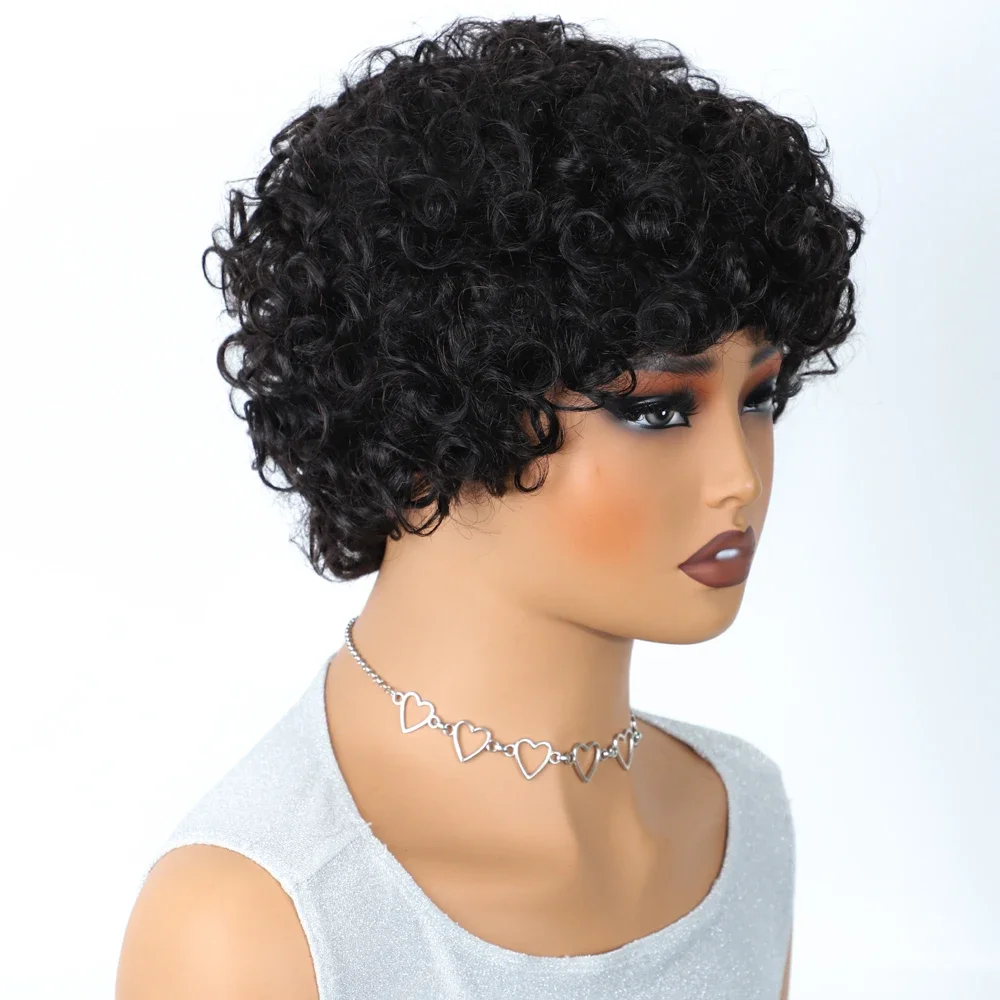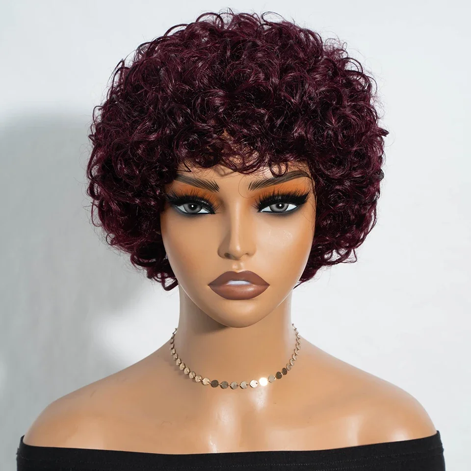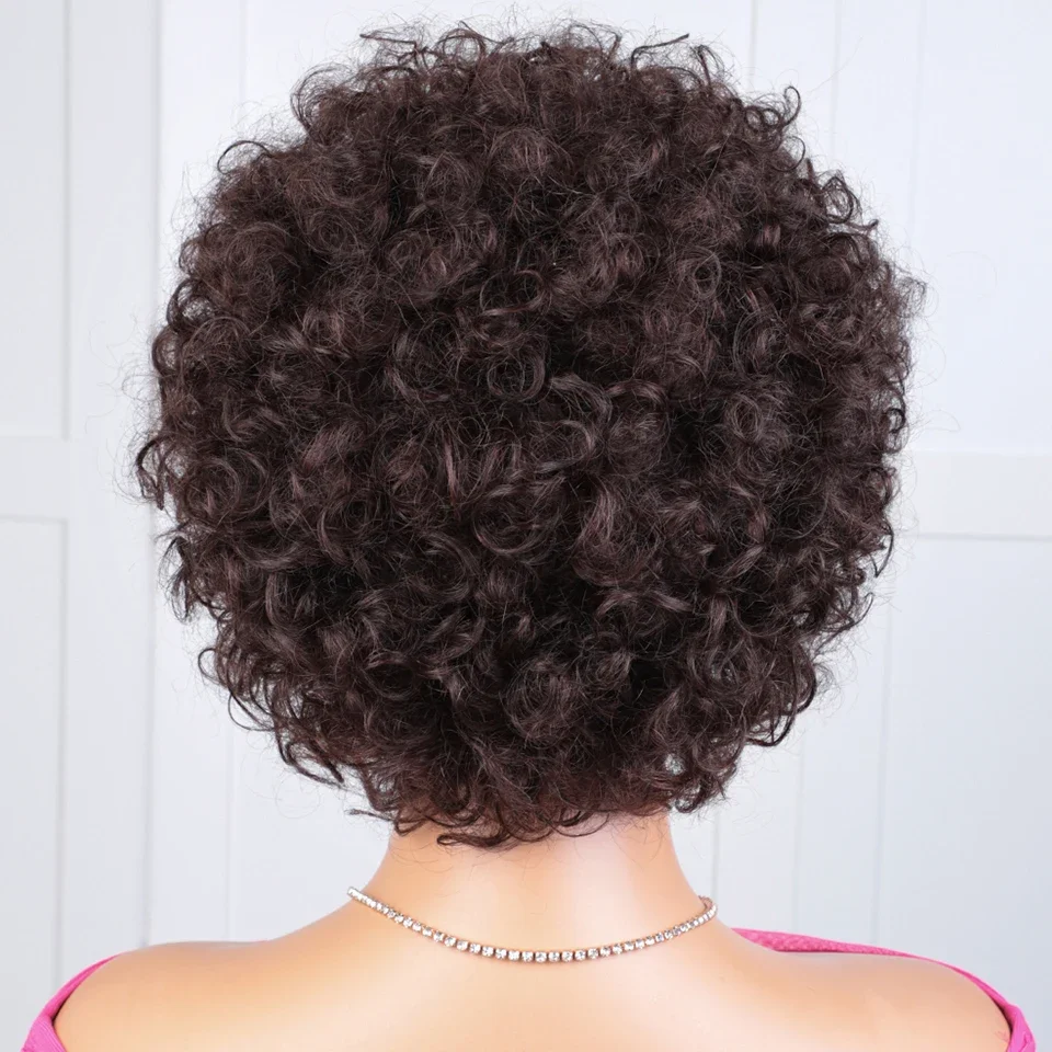 Brazilian Short Bob Pixie Afro Kinky Curly Wigs With Bangs For Black Women Natural Brown 99J Full Machine Made Human Hair Wigs